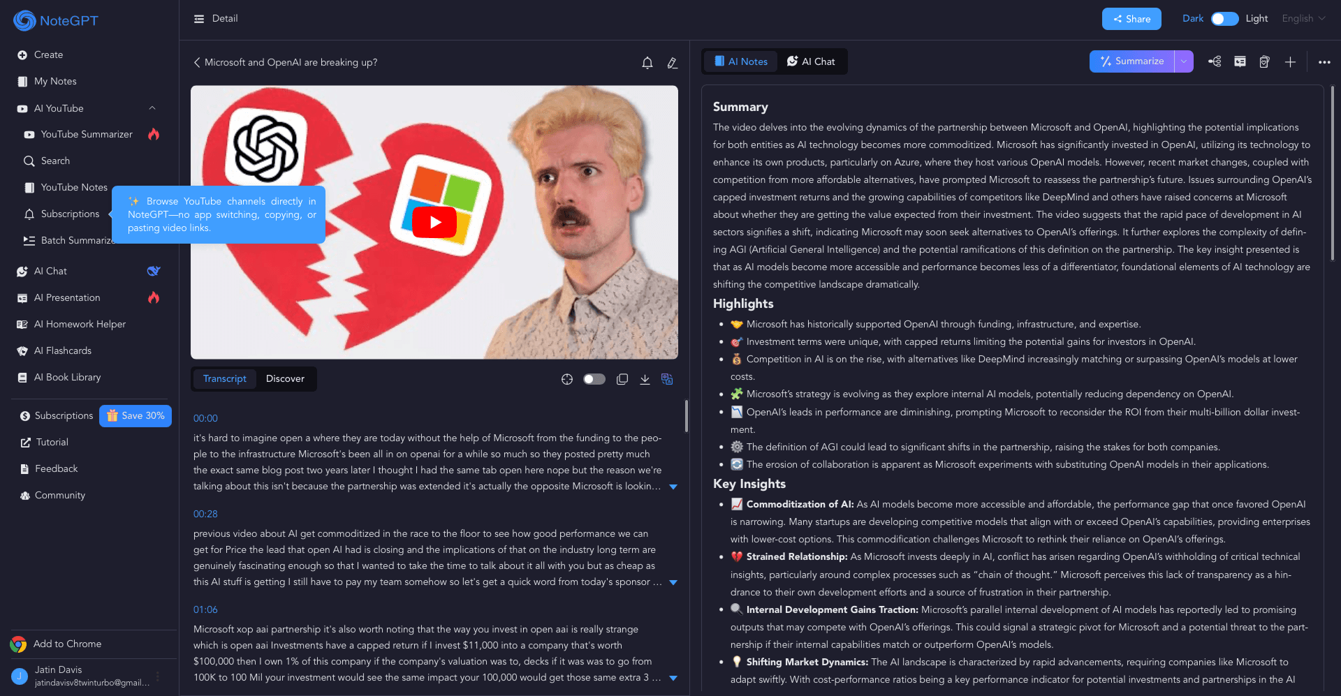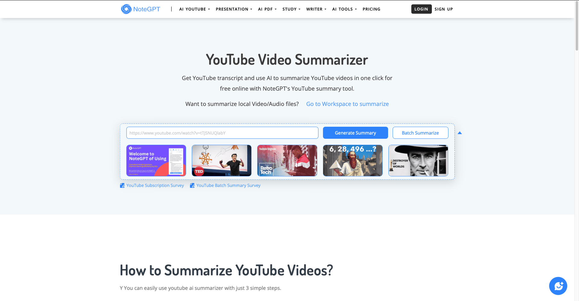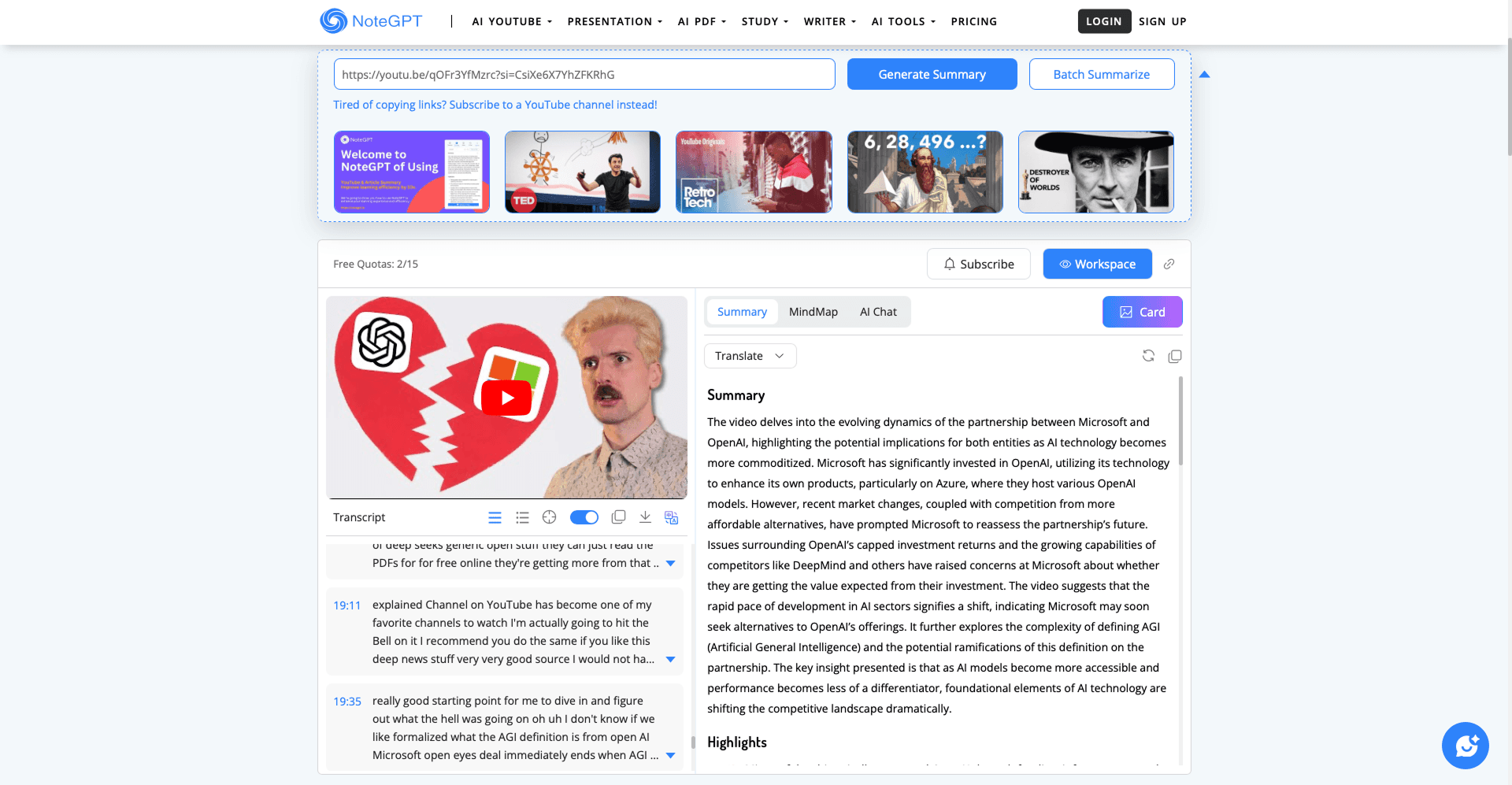 NoteGpt is the leader in summarisation tools. It uses a YouTube link for getting the video transcription and then creates the summary from the transcript.