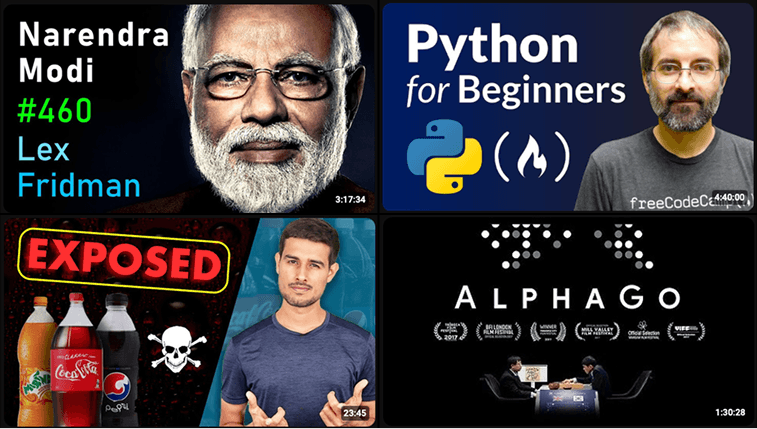 Thumbnails for videos that include podcasts, tutorials, informative videos and documentaries showing the total duration of the videos. These videos are knowledge packed but fairly long.